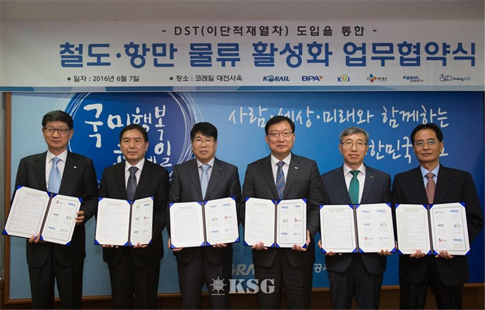 ▲ 사진 왼쪽부터 박근태 CJ대한통운 대표이사, 김기환 한국철도기술연구원 원장, 우예종 부산항만공사 사장, 홍순만 코레일사장, 김명열 코레일로지스 대표이사, 김승영 의왕ICD 대표이사
