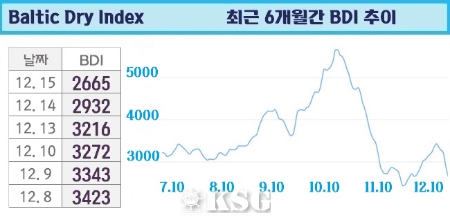 12월15일 건화물선 운임지수(BDI)는 전일보다 267포인트 하락한 2665로 마감됐다. 이날 벌크 시장은 서호주에서 철광석 선적이 크게 감소한 케이프 시장에서 급락이 계속되는 등 모든 선형에서 하락세를 기록했다. 외신에 따르면 호조세를 보였던 벌크 시장이...