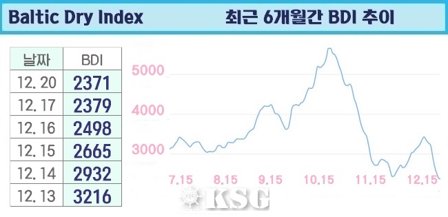 12월20일 건화물선 운임지수(BDI)는 전일보다 8포인트 하락한 2371로 마감됐다. 이날 벌크시장은 급락을 보였던 케이프선이 반등에 성공하고, 파나막스선은 진정 기미를 보이면서 BDI는 하락 폭이 크게 둔화됐다.
