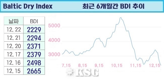 12월22일 건화물선 운임지수(BDI)는 전일보다 65포인트 하락한 2229로 마감됐다. 케이프선과 수프라막스선은 하락세가 지속됐지만 파나막스선은 반등에 성공했다. BDI는 2200선대로 떨어지며 지난 4월15일 이후 8개월여 만에 가장 낮은 수치를 기록했다. 외신에...