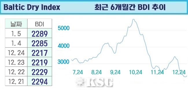 1월5일 건화물선 운임지수(BDI)는 전일보다 4포인트 상승한 2289로 마감됐다. 이날 벌크 시장은 상승세로 출발했던 케이프선이 하락 전환됐다. 파나막스시장은 상승세, 수프라막스선은 하락세가 지속됐다.