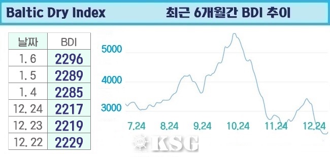 1월6일 건화물선 운임지수(BDI)는 전일보다 7포인트 상승한 2296으로 마감됐다. 이날 벌크 시장은 전일 하락세를 보였던 케이프선이 다시 반등에 성공했다. 파나막스시장은 상승세를 이어갔지만 상승 폭은 둔화됐고, 수프라막스선은 하락세가 지속됐다.