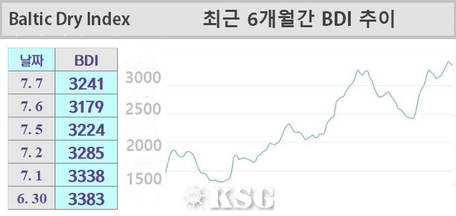 7월7일 건화물선 운임지수(BDI)는 전일보다 62포인트 상승한 3241을 기록했다. 이날 케이프선이 반등에 성공하면서 BDI는 상승 곡선을 그렸다.