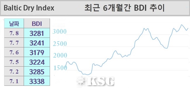 7월8일 건화물선 운임지수(BDI)는 전일보다 40포인트 상승한 3281을 기록했다. 이날 케이프선은 해상운임 선물거래(FFA) 시장에서 큰 폭으로 상승하는 등 벌크 시장은 전일과 비슷한 모습을 보였다.