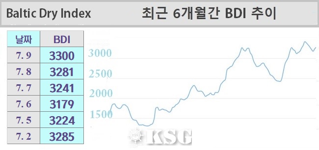 7월9일 건화물선 운임지수(BDI)는 전일보다 19포인트 상승한 3300을 기록했다. 지난 주 벌크 시장은 선물거래(FFA) 시장에서 반등하면서 케이프선은 상승세를 지속했다. 파나막스선은 주 후반 회복세를 보였지만, 수프라막스선은 약보합세를 벗어나지 못했다. 외...