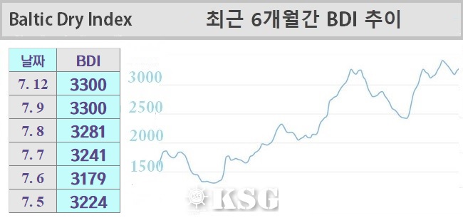 7월12일 건화물선 운임지수(BDI)는 전일과 동일한 3300으로 마감됐다. 이날 벌크 시장은 지난 주 후반의 시황이 이어졌다. 선물거래(FFA) 시장에서 상승세가 이어지면서 케이프선은 상승 곡선을 그렸지만, 중소형선에서는 하락세가 계속되며 상반된 모습을 보였...