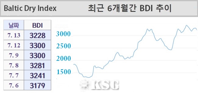 7월13일 건화물선 운임지수(BDI)는 전일보다 72포인트 하락한 3228로 마감됐다. 이날 벌크 시장은 상승세를 이어갔던 선물거래(FFA) 시장이 하락세로 전환되면서 케이프선을 비롯한 모든 선형에서 약세를 기록했다.
