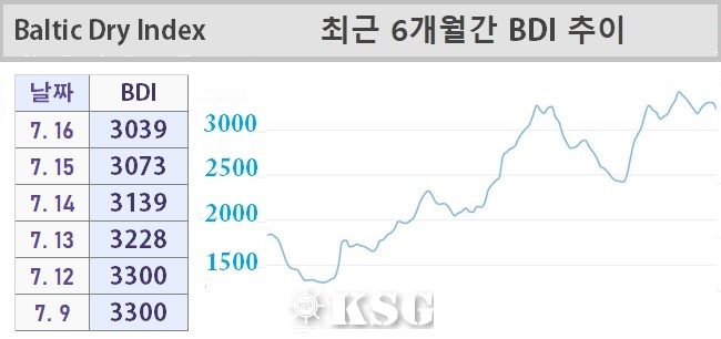 7월16일 건화물선 운임지수(BDI)는 전일보다 34포인트 하락한 3039로 마감됐다. 지난 주 벌크 시장은 선물거래(FFA) 시장의 약세와 모든 선형에서 조정이 발생하면서 부진한 모습을 보였다.