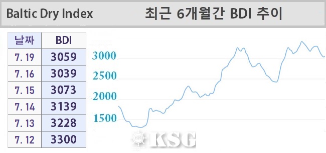 7월19일 건화물선 운임지수(BDI)는 전일보다 20포인트 상승한 3059로 마감됐다. 이날 벌크 시장은 케이프선에서 시황이 살아나면서 반등에 성공했다. 하지만 선물거래(FFA) 시장은 약세를 면치 못하면서 중소형선에서는 약세가 이어졌다.