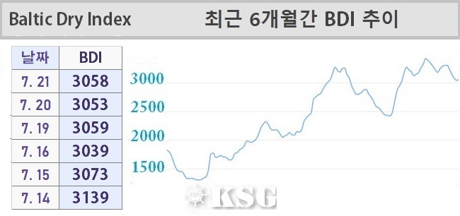 7월21일 건화물선 운임지수(BDI)는 전일보다 5포인트 상승한 3058로 마감됐다. 벌크 시장은 금주 들어 상승과 하락을 반복하고 있다. 이날 케이프 시장과 수프라막스 시장은 상승세를 기록했다.