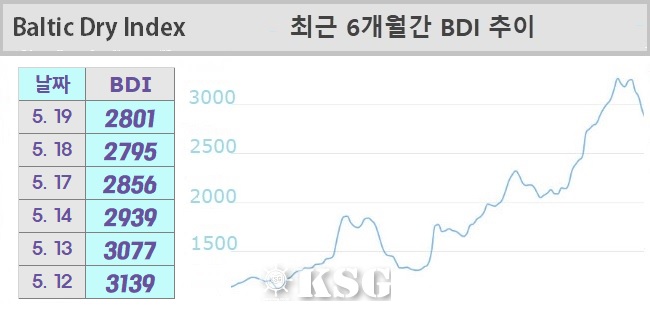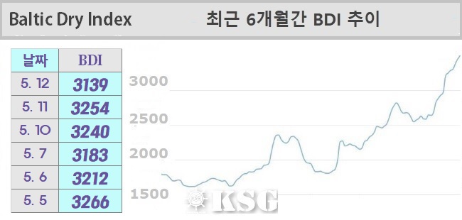 5월12일 건화물선 운임지수(BDI)는 3139를 기록했다. 이날 벌크 시장은 케이프선 하락 폭이 확대되고, 파나막스선이 하락 전환되는 등 시황이 위축됐다. BDI는 전일보다 115포인트 하락했다.
