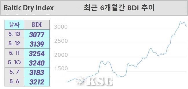5월13일 건화물선 운임지수(BDI)는 3077을 기록했다. 이날 벌크 시장은 중대형선의 하락세가 지속됐다. BDI는 전일보다 62포인트 하락했다.
