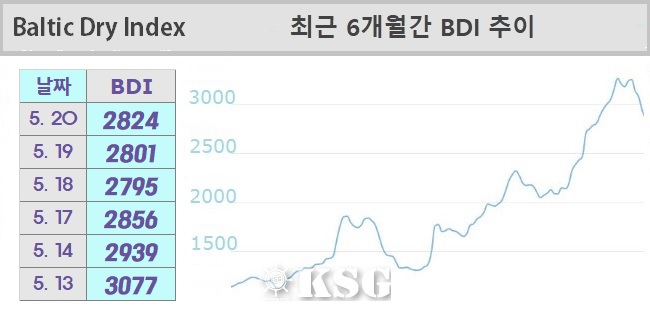 5월20일 건화물선 운임지수(BDI)는 2824를 기록했다. 이날 벌크 시장은 모든 선형에서 신규 수요가 늘어나면서 상승세를 기록했다. 외신에 따르면 최근 케이프선의 일시적인 부진은 코로나로 인해 선원 교체가 지연되면서 선박 가동이 떨어진 것이 한몫했지만...