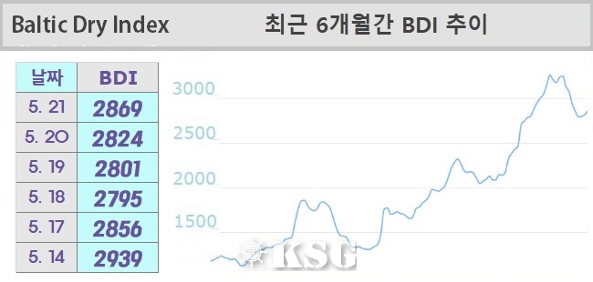5월21일 건화물선 운임지수(BDI)는 2869를 기록했다. 지난 주 벌크 시장은 철광석 가격의 상승 영향으로 케이프선이 반등에 성공했고, 수프라막스선은 태평양 수역을 중심으로 상승세를 이어갔다. 파나막스선은 주 후반 하락세로 전환되며 상반된 모습을 보였다...