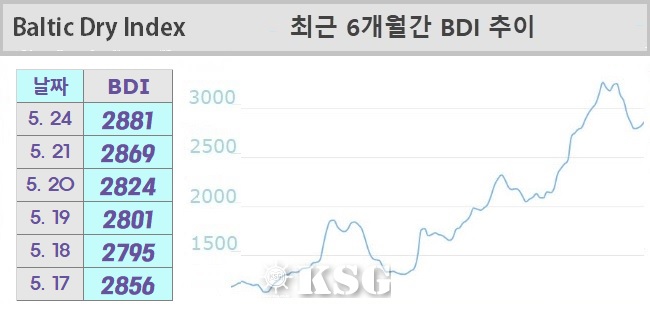 5월24일 건화물선 운임지수(BDI)는 2881을 기록했다. 이날 벌크 시장은 지난 주의 시황이 지속된 가운데 케이프선은 상승 폭이 다소 둔화됐다. BDI는 전일보다 12포인트 상승했다.