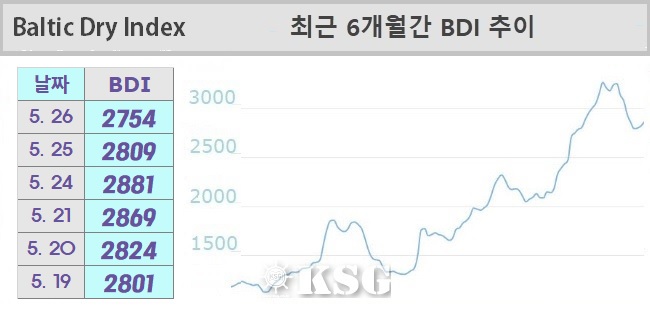 5월26일 건화물선 운임지수(BDI)는 2754를 기록했다. 이날 벌크 시장은 중대형선의 부진이 계속됐다. 반면 수프라막스선은 상승세를 이어갔다. BDI는 전일보다 55포인트 하락했다.