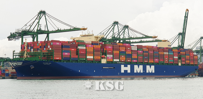 ▲싱가포르항 PSA터미널에 HMM의 2만4000TEU급 컨테이너선 <에이치엠엠오슬로>호가 정박해 있다.