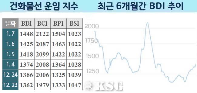 지난 8일 건화물선 운임지수(BDI)는 1606을 기록했다. 지난 주 벌크 시장은 연초부터 중대형선을 중심으로 상승세가 지속됐다. 케이프선은 주 후반 산업용 철강 수요가 견조하게 유입되면서 큰 폭으로 상승했다. BDI는 전일 대비 158포인트 올랐다.