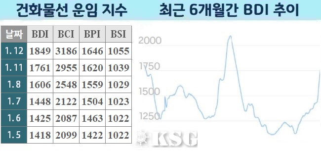 지난 12일 건화물선 운임지수(BDI)는 1849를 기록했다. 이날 벌크 시장은 케이프선의 급등세, 중소형선의 상승세가 이어지면서 전일과 비슷한 시황을 보였다. BDI는 전일 대비 88포인트 올랐다.
