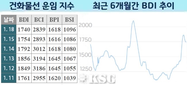 지난 18일 건화물선 운임지수(BDI)는 1740을 기록했다. 이날 벌크 시장은 케이프선의 하락이 지속됐지만 하락세는 둔화됐고, 파나막스선은 반등에 성공했다. BDI는 전일 대비 14포인트 하락했다.
