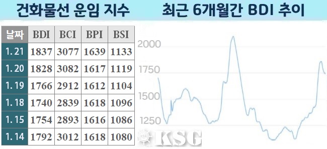 지난 21일 건화물선 운임지수(BDI)는 1837을 기록했다. 이날 벌크 시장은 전날 반등했던 케이프선의 하루만에 다시 하락세로 돌아섰고, 중소형선은 강보합세가 유지됐다. BDI는 전일 대비 9포인트 상승했다.