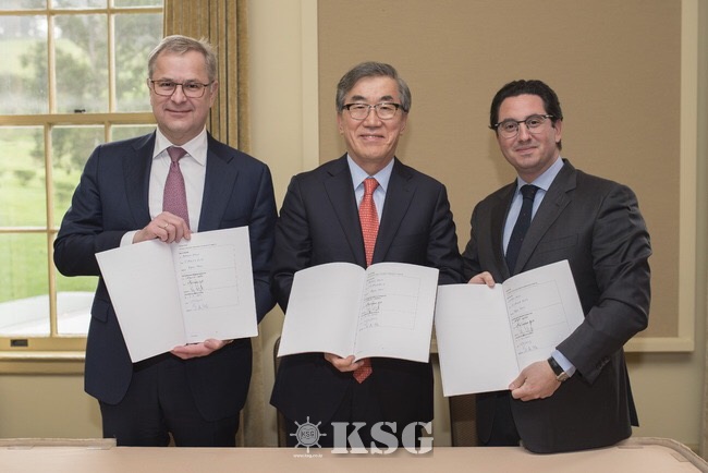 ▲ 16일(한국시간) 미국 샌프란시스코에서 열린‘2M+H 전략적 협력’ 본계약 서명식에서 유창근 현대상선 대표이사(가운데), 쇠렌 스코 머스크라인 CEO(좌측), 디에고 아폰테 MSC CEO(우측)가 서명식을 마치고 기념촬영을 하고 있다.